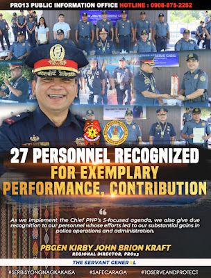 BUTUAN CITY -- Twenty-seven personnel including one non-uniformed personnel (NUP) received awards in recognition of their respective notable accomplishments during the flag-raising ceremony held here today, February 5.